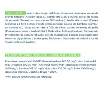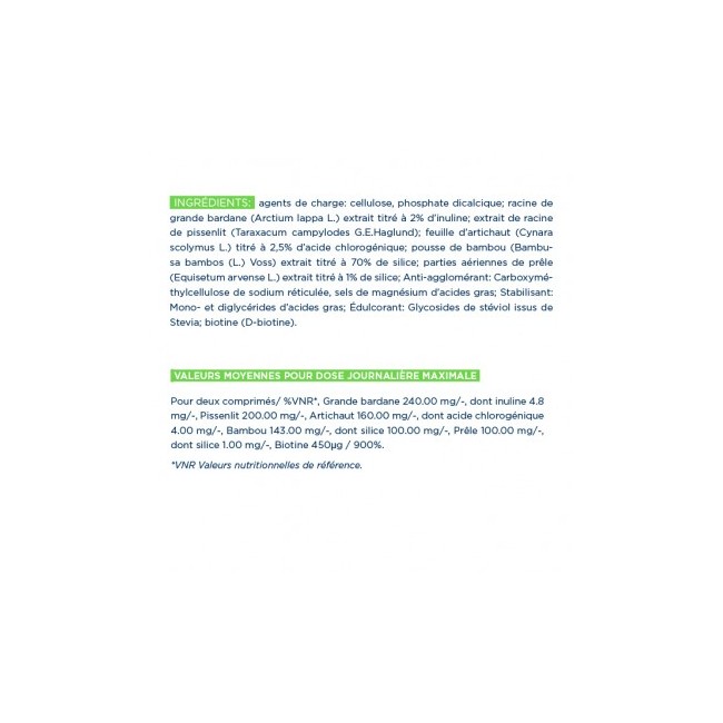 Bardane, pissenlit, artichaut, bambou, prêle, vitamine B8 (biotine).